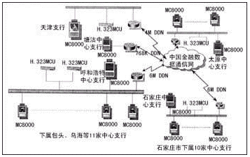 為推進金融行業(yè)的金融電子化進程,并充分利用中國國家金融數(shù)據(jù)通信網(CNFN)的資源,中國人民銀行天津大區(qū)行于1999年建立了首個運行在CNFN上的基于IP的H.323電視會議網,實現(xiàn)了華北范圍內天津、內蒙古、河北、山西兩省一區(qū)一市的36家人民銀行機構的會議電視聯(lián)網。VCON公司提供的基于IP的H.323視頻會議第四代解決方案在該系統(tǒng)中發(fā)揮了重要作用。