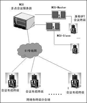 根據(jù)用戶的需求,包括擴容建設(shè)26個點的會議電視系統(tǒng),網(wǎng)絡(luò)環(huán)境為DDN專線E1(2Mbps)方式等,并經(jīng)過嚴(yán)格招標(biāo)、測試和反復(fù)論證,該系統(tǒng)采用了VTEL美國視訊公司的會議室型終端產(chǎn)品銀河(Galaxy)755,以及多點會議服務(wù)器(MCU)。