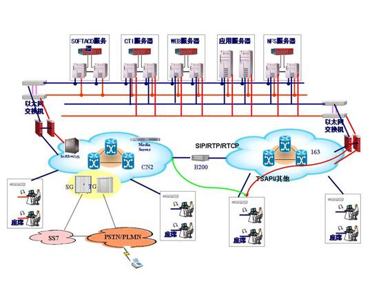 客戶座席可以分布在不同的地點,集中在電信機房的座席可以直接部署到CN2網(wǎng)上,分布在客戶處的座席,可以部署在各地市專網(wǎng)上或者163城域網(wǎng)上。部署在163網(wǎng)和專網(wǎng)上的座席,語音流和SIP協(xié)議通過寬帶接入網(wǎng)關