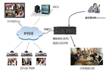 在現(xiàn)有視頻會議網(wǎng)絡(luò)基礎(chǔ)上新增語音網(wǎng)關(guān)設(shè)備,主要負責PSTN、移動網(wǎng)和IP網(wǎng)絡(luò)的信令轉(zhuǎn)接、音頻編碼的轉(zhuǎn)換、多點純語音會議、IVR會議引導(dǎo)。