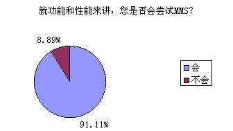 題8的調(diào)查結(jié)果對于中國移動來講絕對是充滿誘惑的,高達91.11%的被訪者表示他們非常愿意嘗試MMS的功能和服務(wù),無疑這對ICP們(MMS服務(wù)的重要載體)也是一針強心劑。