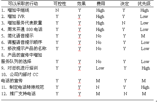 項目小組接下來對列舉的眾多原因合并、歸類并再次進行頭腦風暴,并"可控性"、"實施預(yù)期效果"、"實施費用"、"是否可以由項目小組作決定"、"優(yōu)先級"等幾個方面對可以采取的行動進行逐項分析(見下圖),最終確定1、5、9、10、11、12項納入到實施方案,指定相應(yīng)的實施負責人,制定相應(yīng)實施時間表,實施時長為三個月。