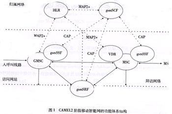 在移動通信領(lǐng)域,歐洲電信標(biāo)準學(xué)會(ETSI)制定的CAMEL系列標(biāo)準為基于GSM移動通信網(wǎng)絡(luò)的移動智能網(wǎng)提供了統(tǒng)一的規(guī)范。其中CAMEL2階段的標(biāo)準符合ITU-T的IN CS-1,支持各種基于語音的智能業(yè)務(wù)。CAMEL2階段移動智能網(wǎng)的功能體系結(jié)構(gòu)如圖1所示。CAMEL3階段的標(biāo)準基于CS-2,主要增加了對GPRS移動數(shù)據(jù)業(yè)務(wù)以及短消息業(yè)務(wù)的支持。