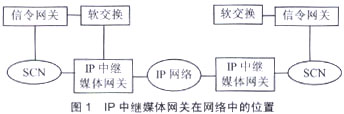IP中繼媒體網關在IP網絡和電路交換網絡(SCN)之間提供媒體映射和代碼轉換功能,即終止電路交換網絡設施(中繼線路),將媒體流分組化并在IP網絡上傳輸,在IP網絡去往SCN的方向也執(zhí)行類似的功能。IP中繼媒體網關在網絡中的位置如圖1所示。