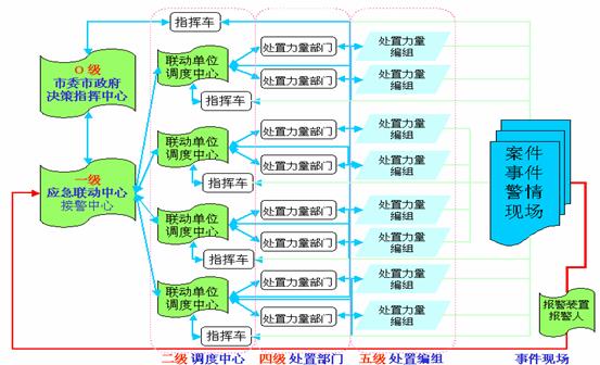 根據(jù)接過來的警情,應(yīng)急聯(lián)動系統(tǒng)向處置力量部門發(fā)出指令派出處置力量編組到現(xiàn)場,并根據(jù)現(xiàn)場反饋回來的信息,決定是否增援或歸隊。事件記錄通過局域網(wǎng)被送到相應(yīng)的處警員終端,處警員通過計算機輔助調(diào)度系統(tǒng)查詢相關(guān)資料,制定反應(yīng)措施,并向相關(guān)聯(lián)動單位發(fā)出具體調(diào)度指令。在緊急事件發(fā)生時,相應(yīng)的電子預(yù)案會被觸發(fā)啟動。如果發(fā)生了重大災(zāi)難,險情或特殊的事件,則可以啟用城市緊急狀態(tài)指揮室,由首長進行統(tǒng)一指揮。