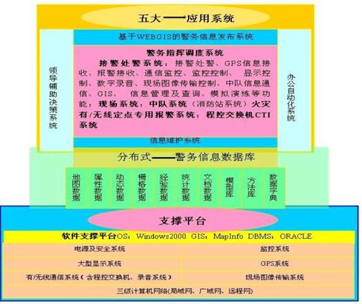 支撐平臺有計算機網(wǎng)絡(luò)系統(tǒng)、監(jiān)控系統(tǒng)、顯示系統(tǒng)、GPS系統(tǒng)、有/無線通信系統(tǒng)、圖像傳輸系統(tǒng)、電源及機房、軟件支撐平臺等。其中,計算機網(wǎng)絡(luò)系統(tǒng)包括指揮中心、二級指揮中心與移動指揮中心、業(yè)務(wù)執(zhí)行機構(gòu)(如:應(yīng)急中隊、派出所等)之間的三級計算機網(wǎng)絡(luò),即指揮中心局域網(wǎng)絡(luò)、業(yè)務(wù)機關(guān)網(wǎng)絡(luò)、與分支機關(guān)的廣域網(wǎng)絡(luò)、與移動指揮中心的遠(yuǎn)程訪問網(wǎng)絡(luò)。指揮中心與二級指揮中心、分支機構(gòu)、移動中心之間有語音通信、數(shù)據(jù)通信,指揮中心與移動中心有語音通信、數(shù)據(jù)通信(無線)、現(xiàn)場圖像傳輸;指揮中心與公安其它機構(gòu)通過撥號網(wǎng)絡(luò)訪問(內(nèi)網(wǎng)),指揮中心與普通老百姓通過撥號網(wǎng)絡(luò)訪問(外網(wǎng))。