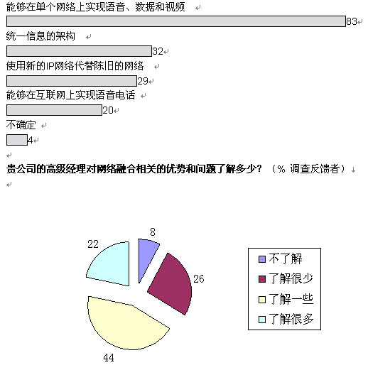 從更為廣泛的層面上看,我們的調(diào)查結(jié)果顯示:三分之一的管理人員對融合網(wǎng)絡(luò)的益處一無所知或者知之甚少。困惑的并不僅是高級經(jīng)理們:分析公司IDC近期對歐洲600余名廣域網(wǎng)管理人員進行的調(diào)查顯示,只有五分之一的人能夠完全了解融合網(wǎng)絡(luò)所實現(xiàn)的各項功能。