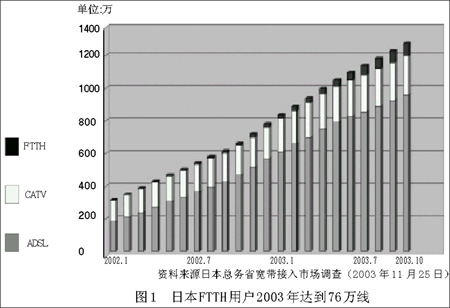從現(xiàn)狀看,在亞洲發(fā)展FTTH比較迅速的是日本和韓國,早在20世紀(jì)90年代初期日本就制定了雄心勃勃的計(jì)劃:2010年使光纖進(jìn)入全國家庭。2001年以來,日本FTTH市場進(jìn)入快速增長階段:2001年只有usen和NTT東日本、NTT西日本幾家公司,而到2002年7月,已經(jīng)有9家公司提供FTTH業(yè)務(wù)。據(jù)日本總務(wù)省統(tǒng)計(jì),到2004年7月,日本FTTH用戶數(shù)已經(jīng)突破130萬,預(yù)計(jì)在2005年達(dá)到450萬。