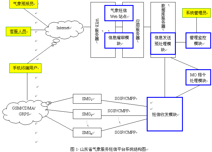 山東省氣象臺為實(shí)現(xiàn)“1210手機(jī)氣象站”服務(wù),通過技術(shù)合作的方式建設(shè)了山東省氣象服務(wù)短信平臺。該平臺采用操作系統(tǒng)無關(guān)、開放性好的J2EE軟件架構(gòu),數(shù)據(jù)庫選用處理能力強(qiáng)、穩(wěn)定性好的Oracle9i大型數(shù)據(jù)庫系統(tǒng),該平臺目前正在為全省50萬用戶每天通過短消息提供各種天氣預(yù)報服務(wù)。下面將主要介紹氣象短信平臺的系統(tǒng)結(jié)構(gòu)、各模塊功能和系統(tǒng)特點(diǎn)。