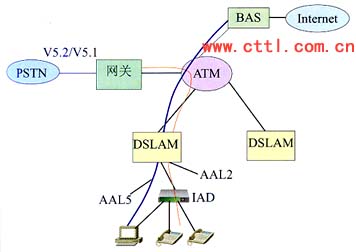 DSL的IAD與VoATMover DSL的類似,可以提供多路POTS或者ISDN接口、以太網(wǎng)接口,上行可以是ADSL或者G.shdsl接口、VDSL接口,直接接入DSLAM。不同的是,IAD與網(wǎng)關(guān)之間傳輸分組語音數(shù)據(jù),IAD需要配置相應(yīng)的IP地址。網(wǎng)關(guān)提供E1接口通過V5.2或者V5.1協(xié)議接入到PSTN網(wǎng)。與第一種方案不同的是,DSLAM不需要支持AAL2信元的識別,這里的DSLAM可以是ATMDSLAM或者是IP
