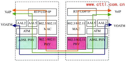 VoATM over DSL是基于ATM技術(shù)提供話音業(yè)務(wù),話音業(yè)務(wù)和數(shù)據(jù)業(yè)務(wù)分別通過AAL2和AAL5進(jìn)行封裝。AAL2技術(shù)是專為在ATM網(wǎng)絡(luò)上傳輸語音而設(shè)計的,在分組語音數(shù)據(jù)的封裝處理、多個分組語音數(shù)據(jù)如何在一條VC上傳送等有著嚴(yán)格的定義,它不需要為IAD配置IP地址。因此,VoATM是一種在ATM數(shù)據(jù)網(wǎng)上提供語音的解決方案,語音業(yè)務(wù)必須在AAL2信元中傳輸,只能應(yīng)用于ATM網(wǎng)絡(luò),不能應(yīng)用于以IP網(wǎng)絡(luò)為主的數(shù)據(jù)網(wǎng)。
