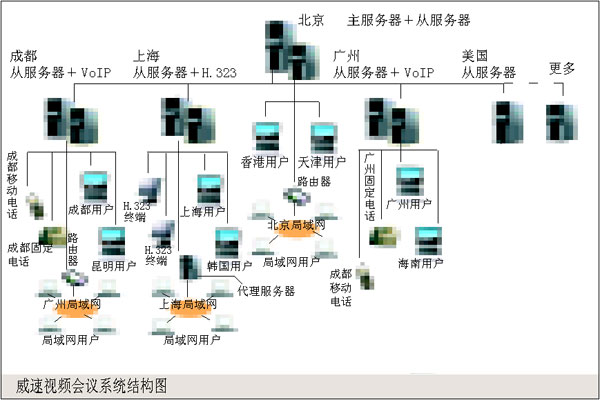 。。本系統(tǒng)中包含多個會場,使用瑞福特SM 880硬件終端,每個會場采用單獨的ADSL接入(也可采用其他接入方式),能夠保證發(fā)送與接收320×240、25