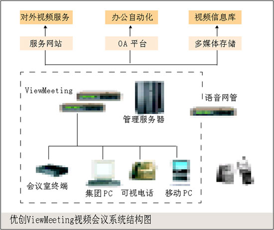 。。ViewMeeting是優(yōu)創(chuàng)科技利用最新的視頻通信技術(shù),面向企業(yè)用戶推出的功能強大的可視協(xié)同辦公系統(tǒng)。它是綜合了最新的視頻會議、數(shù)據(jù)協(xié)作、即時通信、語音網(wǎng)關(guān)等多種技術(shù)的企業(yè)協(xié)同辦公產(chǎn)品,能最大程度地滿足企業(yè)機構(gòu)的視頻通信需求。利用ViewMeeting,用戶可以方便地在企業(yè)網(wǎng)上進行視頻會議、網(wǎng)上培訓(xùn)、即時點到點通信、協(xié)作討論等多種應(yīng)用。企業(yè)可以選用以下產(chǎn)品組建ViewMeeting系統(tǒng):