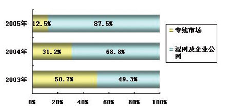 2004年,基于專線網(wǎng)絡(luò)的視頻會(huì)議系統(tǒng)與基于混網(wǎng)和企業(yè)公網(wǎng)的產(chǎn)品比例發(fā)生了轉(zhuǎn)折性變化,基于混網(wǎng)和企業(yè)公網(wǎng)的產(chǎn)品占到了68.8%的比例,成為了市場(chǎng)主流。計(jì)世資訊(CCW Research)研究表明:2005年,這一趨勢(shì)更趨明顯,基于混網(wǎng)和企業(yè)公網(wǎng)產(chǎn)品的比例將高達(dá)87.5%。