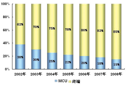 一般來(lái)說(shuō),終端和MCU是視頻會(huì)議系統(tǒng)產(chǎn)品最為關(guān)鍵的部分。計(jì)世資訊(CCW Research)的研究表明:近年來(lái),終端的銷售比例持續(xù)增長(zhǎng),而MCU的銷售比例則相應(yīng)萎縮。2005年,終端和MCU的比例分別為78.0%和22.0%。