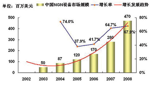 對(duì)于中國(guó)NGN市場(chǎng)規(guī)模的預(yù)測(cè),主要取決于各個(gè)運(yùn)營(yíng)商在NGN方面的戰(zhàn)略發(fā)展重點(diǎn),以及重點(diǎn)的投資方向?傮w上來說,從2003年起,以IPTV、VOIP、寬帶接入等業(yè)務(wù)為代表的NGN的部分業(yè)務(wù)的推廣,使得事實(shí)上中國(guó)已經(jīng)形成一定的NGN的市場(chǎng)規(guī)模,盡管這一市場(chǎng)規(guī)模仍然很小。2004年中國(guó)的NGN基礎(chǔ)設(shè)備的市場(chǎng)規(guī)模超過8千萬(wàn)美元,以后隨著各個(gè)運(yùn)營(yíng)商N(yùn)GN戰(zhàn)略的進(jìn)一步清晰,這一部分的投資會(huì)保持持續(xù)穩(wěn)定的增長(zhǎng),2005~2008年以后的NGN設(shè)備投資規(guī)模的平均增長(zhǎng)率可以達(dá)到50%。