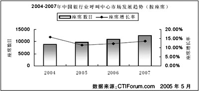 根據(jù)CTI論壇預(yù)測,到2007年,銀行業(yè)呼叫中心的座席總數(shù)將達(dá)到12500個,累計投資額將達(dá)到70億元。2005年到2007年的投資額復(fù)合年平均增長率為14.86%。未來,銀行業(yè)在未來三年內(nèi)的發(fā)展穩(wěn)定,并以較高速度增長。