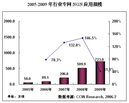在運(yùn)營商N(yùn)GN建設(shè)高速增長的同時,政府、能源、交通等行業(yè)專網(wǎng)NGN建設(shè)也逐漸步入快車道。NGN在行業(yè)專網(wǎng)的應(yīng)用,到2005年底的應(yīng)用規(guī)模達(dá)到50萬線,根據(jù)計世資訊(CCW Research)《2005-2006中國NGN產(chǎn)業(yè)應(yīng)用趨勢研究報告》的預(yù)測,未來4年,NGN在行業(yè)專網(wǎng)市場將以95%的復(fù)合增長率高速增長。