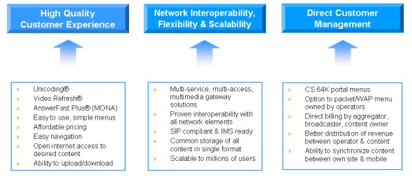 Refresh®和AnswerFast Plus® (MONA的一部分),同時多媒體網(wǎng)關(guān)解決方案也包括在內(nèi)。其它方面的可互操作性和用戶體驗(yàn)改善問題很容易能解決,對今天現(xiàn)有的WAP服務(wù)是一種補(bǔ)充。
