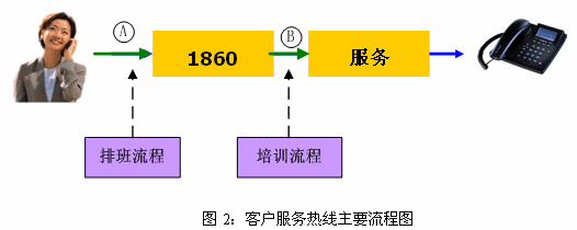 因此,根據(jù)客戶服務(wù)中心的實(shí)際情況,我們首先優(yōu)化了排班流程,建立并優(yōu)化了培訓(xùn)流程。我們首先選擇這兩個(gè)流程的思路如下:從客戶角度來看,10086熱線在接受用戶咨詢服務(wù)時(shí)的主要流程如下:撥號(hào)→1860→服務(wù)提供→掛機(jī)。圖示如下: