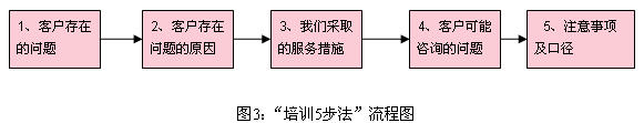從上圖,我們可以看出,影響服務(wù)質(zhì)量主要有A、B兩個(gè)關(guān)鍵控制點(diǎn),決定A點(diǎn)服務(wù)質(zhì)量的主要是排班流程,它影響客戶接入的速度和客戶的等待時(shí)間,即決定了10086的接通率;決定B點(diǎn)服務(wù)質(zhì)量的主要是培訓(xùn)流程,它直接影響服務(wù)人員的業(yè)務(wù)知識(shí)和服務(wù)能力,從而影響服務(wù)質(zhì)量。由此,我們優(yōu)化了排班流程、新建了客服代表的培訓(xùn)流程,有效地保證了上述關(guān)鍵環(huán)節(jié)的服務(wù)質(zhì)量。排班流程優(yōu)化的具體方法在筆者的前一篇文章《流程與組織能力》中已經(jīng)作了詳細(xì)的介紹,下面結(jié)合實(shí)際來介紹我們新的培訓(xùn)流程-“培訓(xùn)五步法”。