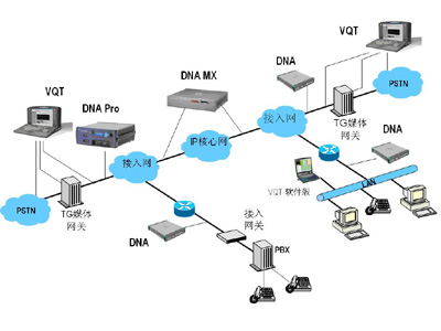 以上兩種測試方法也可以結(jié)合使用,在進行端到端VQT測試時,在NGN網(wǎng)絡的中間網(wǎng)段(根據(jù)需要可以設置多個監(jiān)測點)部署分布式網(wǎng)絡分析儀(DNA),進行被動式RTP/RTCP監(jiān)測,從而判斷出造成語音質(zhì)量下降的環(huán)節(jié)所在。如下圖所示: