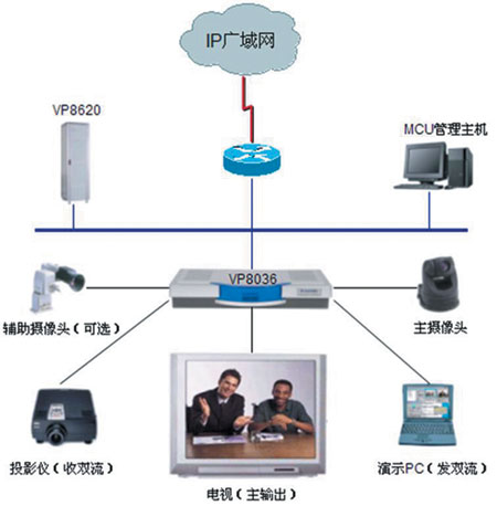 一般我們建議在電視會議室配置兩臺帶S-Video端子或者復合端子的電視機或者背投,一臺用于顯示遠端會場畫面,一臺用于顯示本端會場畫面。電視機尺寸可根據(jù)會場大小來選擇。另外我們還建議在會場布置一臺高分辨率投影儀,用于顯示雙流畫面(PC畫面)。
