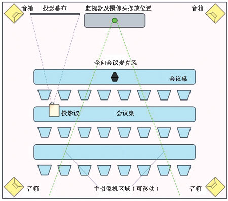 會場設(shè)計的好壞是視頻會議系統(tǒng)實施成敗的關(guān)鍵。視頻會議系統(tǒng)并不單純是將幾個視頻交換平臺和終端通過網(wǎng)絡(luò)連接起來就可以順利運行了,需綜合考慮會場的網(wǎng)絡(luò)環(huán)境、位置及大小、燈光和電源等因素,才能在會議音視頻質(zhì)量、會議功能、操作簡便性及穩(wěn)定性等方面發(fā)揮最優(yōu)的功能。