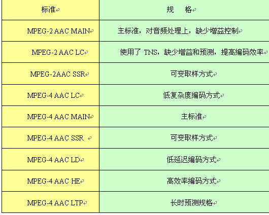 目前國際上對音頻處理技術(shù)上標(biāo)準(zhǔn)較多,在對下一代實(shí)時(shí)交互音頻處理上可以采用MPEG-1Layer2或AAC系列音頻,對選用標(biāo)準(zhǔn)的原則是,音頻頻響范圍要達(dá)到22KHz,這樣就幾乎可以覆蓋了人耳聽覺的全部范圍,甚至在高頻方面還有所超越,能夠使現(xiàn)場音頻得到真實(shí)自然的還原,并且在還原時(shí)可以采用雙聲道立體聲回放,使整個(gè)視頻通訊的聲音有更強(qiáng)的臨近感,達(dá)到CD級音質(zhì)。同時(shí)在對鏈路帶寬的適應(yīng)和編解碼效率上達(dá)到最佳。下表列出AAC的9種規(guī)格。