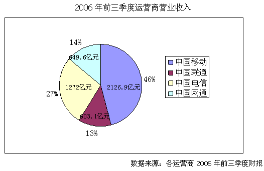 近日,四大運(yùn)營商紛紛公布2006年前三季度的財(cái)務(wù)報(bào)表,截止9月底中國移動營運(yùn)收入達(dá)到2126.91億元,比上年同期增長20.8%,遠(yuǎn)遠(yuǎn)高于競爭對手中國聯(lián)通的營業(yè)收入增長5.6%,而固網(wǎng)運(yùn)營商中國電信和中國網(wǎng)通的收入增長更低,僅為4.5%和2.03%。透過這些數(shù)字,我們看到的是運(yùn)營商實(shí)力差距的進(jìn)一步拉大。