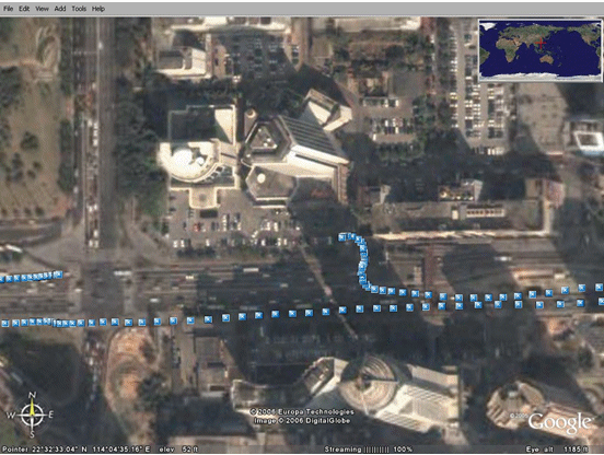 下圖顯示的是在中國深圳市進(jìn)行汽車試駕時(shí)的GPS數(shù)據(jù),利用的是Google earth應(yīng)用程序。圖中的每一個(gè)藍(lán)點(diǎn)代表一個(gè)GPS讀數(shù)。這些點(diǎn)在每隔一秒的時(shí)間內(nèi)讀出,因此,連續(xù)點(diǎn)之間的距離就代表著汽車的速度。我們甚至可以看見汽車駛?cè)氪髽堑耐\噲?chǎng)。