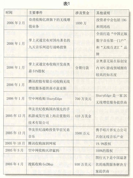 從2003年開始,國內(nèi)就顯現(xiàn)出并購增值服務(wù)運(yùn)營企業(yè)的苗頭。2004年以來,隨著整治增值服務(wù)運(yùn)營企業(yè)的力度不斷加大,并購漸成風(fēng)潮(見表1)。2004年2月,新浪收購深圳網(wǎng)興科技公司;2004年5月,搜狐收購手機(jī)WAP服務(wù)提供商北京吉菲爾公司。2005年,在“超級(jí)女生”節(jié)目大獲成功后,掌上靈通宣布將對(duì)國內(nèi)著名的九天音樂網(wǎng)進(jìn)行戰(zhàn)略投資,全面打造“中國正版數(shù)字音樂第一門戶”和“無線百老匯”品牌。各大移動(dòng)增值業(yè)務(wù)服務(wù)商通過并購競(jìng)爭(zhēng)對(duì)手,門戶網(wǎng)站可以在移動(dòng)增值服務(wù)領(lǐng)域?qū)で笮碌耐黄,獲得可觀的利益,增強(qiáng)自身的競(jìng)爭(zhēng)力。伴隨著3G商用的日益臨近和市場(chǎng)競(jìng)爭(zhēng)的不斷加劇,主流SP(服務(wù)提供商)進(jìn)一步加快了資本購并和業(yè)務(wù)整合的步伐,整個(gè)SP行業(yè)將加速洗牌。經(jīng)過市場(chǎng)整合,主流SP將不斷做大做強(qiáng),而相當(dāng)多的缺乏市場(chǎng)競(jìng)爭(zhēng)力的SP將被淘汰出局。