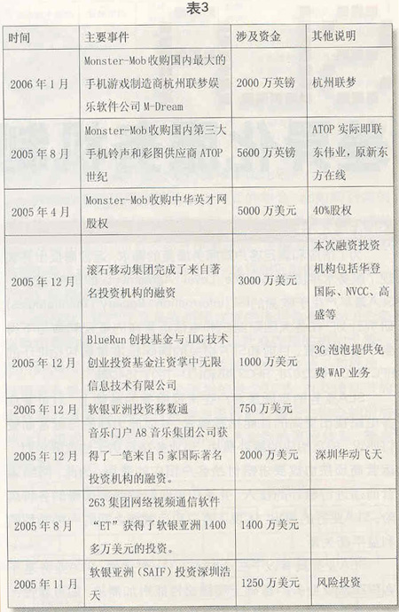 近幾年來,一些資本投資商將投資的重點(diǎn)放到了無線音樂、手機(jī)游戲和手機(jī)視訊等業(yè)務(wù)領(lǐng)域,逐步加大了對(duì)SP的投資力度(見表3)。進(jìn)入2005年以來,著眼于2.5G向3G的全面演進(jìn),風(fēng)險(xiǎn)投資對(duì)SP的投資力度進(jìn)一步加大。以滾石移動(dòng)為例,在2002年和2004年獲得兩輪風(fēng)險(xiǎn)投資之后,滾石移動(dòng)憑借在無線音樂領(lǐng)域取得的良好市場(chǎng)業(yè)績,又獲得了智基創(chuàng)投、華登國際、聯(lián)想投資等公司的投資,投資金額達(dá)3000萬美元。繼2004年10月獲得IDG投資以后,2005年12月7日,國內(nèi)著名的數(shù)字音樂門戶——A8音樂集團(tuán)獲得了包括IDG和Intel投資公司在內(nèi)的5家國際著名投資機(jī)構(gòu)的投資,投資金額達(dá)2000萬美元。同月,掌中無限則獲得了來自全球性風(fēng)險(xiǎn)投資商BlueRun創(chuàng)投基金和IDG總額達(dá)上千萬美元的投資。