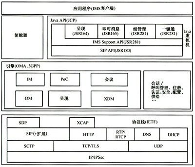 通過對于IMS客戶端相關(guān)規(guī)范的研究與分析,可以看出IETF提供了IMS客戶端所需要的協(xié)議部分,包括詳細(xì)的SIP信令消息交互,服務(wù)參數(shù)協(xié)商、媒體流的建立、XML文檔的交互等。3GPP和OMA提供了IMS客戶端所需要的服務(wù)引擎,與不同應(yīng)用服務(wù)器之間的交互方式以及如何接入到IMS網(wǎng)絡(luò)等。JCP提供了一整套IMS客戶端上Java應(yīng)用程序所需的標(biāo)準(zhǔn)Java應(yīng)用編程接口。由此可以總結(jié)歸納出IMS客戶端軟件架構(gòu)參考,具體參見圖2。