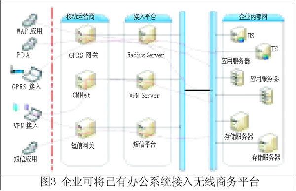 這里介紹的無線商務(wù)平臺(tái)適合沒有成型信息系統(tǒng)的企業(yè)接入,對于企業(yè)已經(jīng)建有辦公系統(tǒng)的情況,可以提供專線接入的無線商務(wù)解決方案(如圖3所示),企業(yè)通過專線接入無線商務(wù)平臺(tái),這種情況需要對企業(yè)辦公系統(tǒng)進(jìn)行一定的改造來實(shí)現(xiàn)全部移動(dòng)辦公功能。