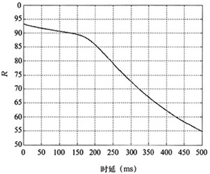 對實(shí)時的語音和視頻業(yè)務(wù)來說,業(yè)務(wù)數(shù)據(jù)端到端的時延最為關(guān)鍵,從仿真結(jié)果圖6和圖7可以看出時延對R系數(shù)和MOS值的影響:隨著時延的增加,R系數(shù)和MOS值都降低,即語音質(zhì)量變差。當(dāng)時延大于150ms時,語音質(zhì)量下降的比較厲害。