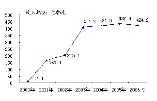 經(jīng)過6年多的運營,韓國電信的eBilling業(yè)務(wù)發(fā)展良好,目前與其合作的ICP已達(dá)到500多家,內(nèi)容涵蓋了收費郵箱、在線軟件銷售、聊天、娛樂、游戲、漫畫、綜合信息等;業(yè)務(wù)收入也逐年上升,從2000年的14.1億韓元(折合人民幣0.11億元)增長到2006年9月份的424.2億韓元(折合人民幣3.3億元),如圖2、圖3所示。