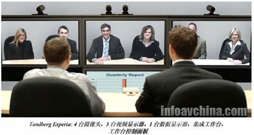 MXP信號(hào)編解碼器、4臺(tái)高分辨率攝像頭和3臺(tái)50英寸的等離子顯示器,用戶播放視頻內(nèi)容,1臺(tái)50英寸等離子顯示器安放在中央視頻顯示屏幕下方,顯示數(shù)據(jù)信息。同時(shí),Experia系統(tǒng)還包括了遠(yuǎn)程呈現(xiàn)控制臺(tái),為用戶提供了三種木制造型選擇,控制臺(tái)上的3臺(tái)麥克風(fēng)構(gòu)成了音頻系統(tǒng)。系統(tǒng)每通信站點(diǎn)支持6位與會(huì)者參與會(huì)議。與其它遠(yuǎn)程呈現(xiàn)系統(tǒng)一樣,Experia在聲音和圖像方面的性能非常出色,系統(tǒng)使用簡(jiǎn)單、穩(wěn)定可靠。泰德的遠(yuǎn)程呈現(xiàn)系統(tǒng)雖然采用與寶利通類似的H.323/SIP標(biāo)準(zhǔn),在系統(tǒng)與業(yè)界標(biāo)準(zhǔn)的協(xié)同工作以及用戶之間互聯(lián)互通的性能方便似乎更勝一籌。