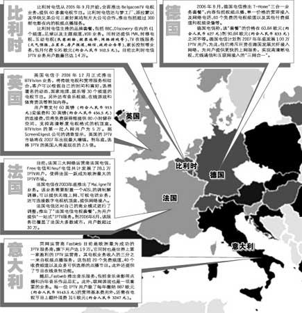 對于歐洲觀眾來說,IPTV(網(wǎng)絡(luò)付費(fèi)電視)就是他們未來的生活主畫面之一。他們只需每月交付30歐元(約合人民幣309元)到60歐元(約合人民幣618元)的費(fèi)用,便可在電視或電腦上選擇收看上百個頻道的電視節(jié)目。歐洲雖然缺乏強(qiáng)大的衛(wèi)星網(wǎng)絡(luò)作為技術(shù)支持,不過卻擁有多家實力雄厚的電信營運(yùn)商,這些巨頭們擁有相同的興趣和市場,正考慮是否聯(lián)合經(jīng)營,共同分食歐洲網(wǎng)絡(luò)電話電視市場這塊“大蛋糕”。