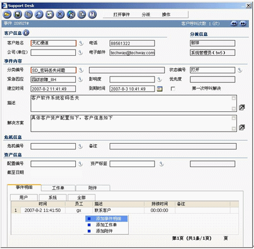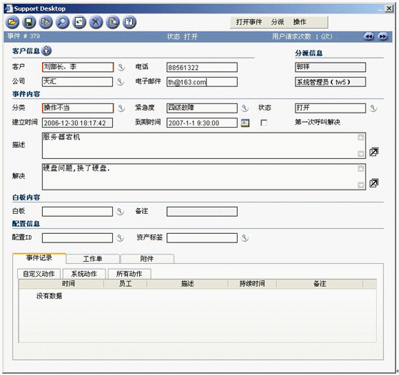 事件記錄應(yīng)該在某個服務(wù)臺工具中記錄和跟蹤,該工具最好是作為集成的服務(wù)管理工具集的構(gòu)成部分。該工具應(yīng)該在引發(fā)新的事件時提供最基本的事件記錄。比如為了幫助提高效率,當(dāng)你在天匯幫助臺的用于記錄事件的事件窗口中輸入請求發(fā)起者的姓名時,利用客戶數(shù)據(jù)庫可以自動填充諸如位置、部門和聯(lián)系詳細(xì)信息等字段。天匯幫助臺還支持使用計算機(jī)電話集成