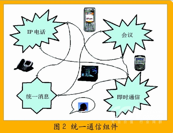 通信的終端可能是桌面電話(huà)、計(jì)算機(jī)、手機(jī)或者PDA。這4個(gè)部分之間存在緊密的聯(lián)系,比如說(shuō)電話(huà)語(yǔ)音可以轉(zhuǎn)換為統(tǒng)一消息;電話(huà)不可達(dá)時(shí),可以采用即時(shí)消息溝通或者小組成員可以使用多種方式參與到同一個(gè)會(huì)議中來(lái)等等。而所有這些聯(lián)系可能建立在統(tǒng)一的平臺(tái)之上: