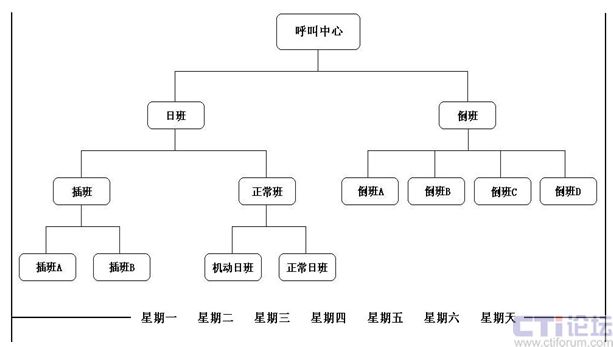 一般正常日班人員應是機動日班人員的四倍(規(guī)模較小的呼叫中心,可不用編排機動日班人員),插班的方式可以應付呼叫中心高峰呼叫量。這樣的班次編排,即可確保呼叫中心日間的工作覆蓋面,緩解因高峰時間而有可能對呼叫中心造成呼叫流失量的情況,亦可應付特發(fā)事件。