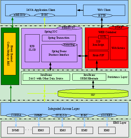 展現(xiàn)層分為兩類用戶界面,一種是Java Application類胖用戶界面;另外一種是純HTTP Web瘦客戶界面。Java Application頁(yè)面用于實(shí)現(xiàn)拓?fù)涔芾淼痊F(xiàn)階段不易于采用Web技術(shù)實(shí)現(xiàn)的交互頁(yè)面,與其他各層的交互協(xié)議主要采用RMI-IIOP或JDBC。