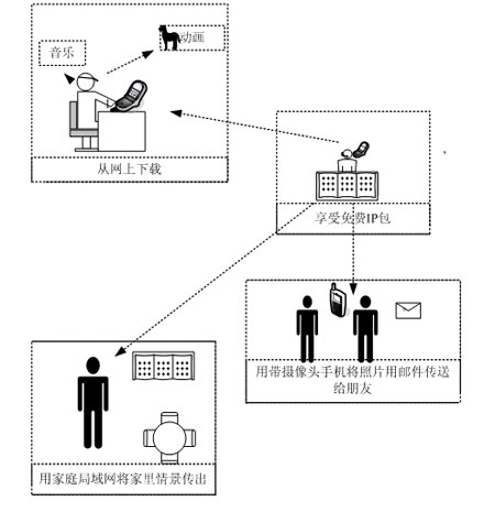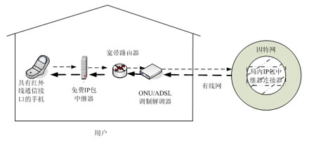 DoCoMo公司網(wǎng)里現(xiàn)有這類手機(jī)共37種),通過(guò)無(wú)線方式與免費(fèi)IP包傳輸中繼器相連,免費(fèi)IP包傳輸中繼器通過(guò)以太網(wǎng)經(jīng)過(guò)寬帶路由器或通過(guò)PPPoE(Point