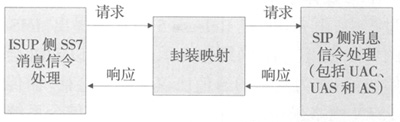 由于ISUP同SIP采用不同的消息封裝機(jī)制,ISUP采用的是二進(jìn)制編碼,而SIP采用文本編碼方式。因此,MGC收到ISUP消息后通過ISUP-MIME方式把ISUP消息內(nèi)容封裝在SIP消息體中,傳送到SIP接收端MGC再把所需內(nèi)容提取出來,從而完成對(duì)ISUP消息的透明傳送,實(shí)現(xiàn)IP網(wǎng)同PSTN網(wǎng)絡(luò)的無縫連接。具體過程見圖。