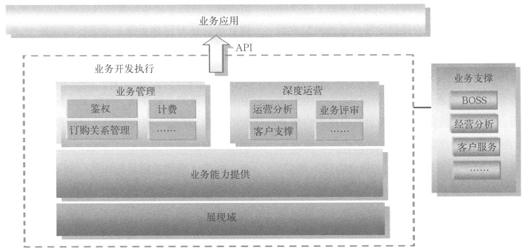根據(jù)移動增值業(yè)務特征及業(yè)務部署、管理需求,目標網(wǎng)絡架構中將實現(xiàn)業(yè)務與控制的分離,劃分業(yè)務控制域和業(yè)務開發(fā)執(zhí)行域,并可開放公共接口實現(xiàn)各增值業(yè)務應用無差別的接入、管理及功能調用,以方便的實現(xiàn)業(yè)務的融合、業(yè)務功能的靈活組合,更利于高效、簡便的實現(xiàn)業(yè)務部署、開發(fā)及運營。