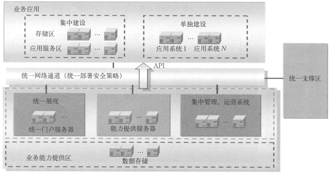 。5)應用業(yè)務區(qū):統(tǒng)一搭建應用硬件平臺,實現(xiàn)應用業(yè)務區(qū)業(yè)務應用及業(yè)務能力提供區(qū)接入通道類型的新增,均可直接在其硬件平臺上加載應用軟件、提供服務,調用現(xiàn)有資源實現(xiàn)。個別因為系統(tǒng)本身需求需要單獨建設、部署的系統(tǒng)則保留其單獨建設的方式。