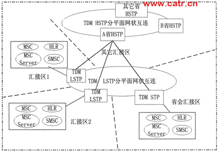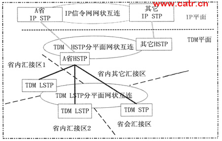 按照混合方式的網(wǎng)絡(luò)組織如下:作為TDM信令網(wǎng)的補(bǔ)充,IP STP和TDM STP共同承擔(dān)省會(huì)匯接區(qū)的業(yè)務(wù)。IP