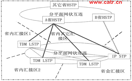 IP STP兼做L/HSTP。IP STP同時(shí)與B省HSTP開通B鏈路。省會(huì)匯接區(qū)到B省的省際長途業(yè)務(wù)直接通過IP