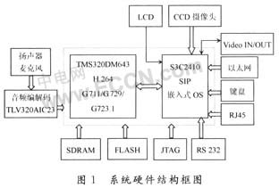 系統(tǒng)硬件主要由TI公司的TMS320DM643和三星公司的S3C2410組成。其中TMS320DM643完成音頻壓縮編解碼G.711/G.729/G.723.1和視頻壓縮編解碼H.264;S3C2410完成SIP協(xié)議和嵌入式OS及各種接口如RS232、復(fù)合視頻輸入/輸出、數(shù)字CCD攝像頭、LCD、RJ45、以太網(wǎng)、鍵盤等。音頻信號(hào)的輸入/輸出通過TI公司的TLV320AIC23送入TMS320DM643進(jìn)行壓縮編碼。